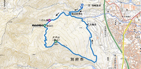 | (5) 8時41分頃、別府三大秘湯でも、もっとも人気がある、と言われている、へびん湯です。標高520m。歩行距離約1.4km。 |