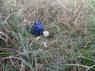 (15) 山頂は背丈以上あるススキで生い茂り、眺望は良くありません。三角点も○印の中ですが、良くわかりません。 |