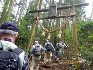 | (11) 10時15分頃、目指す彦岳が前方に現れます。距離約1.2Km。標高約532m。 | (12) 10時27分頃鳥居です。距離約1.38Km。標高約600m。後一息です。 | |