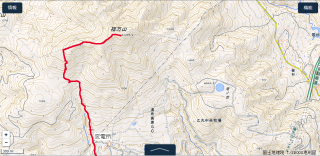 | (1) 地形図① 車走行(緑線)と登山コース(赤線) 登山コースはGPSの軌跡を写したものであくまで概念図です。クリックで拡大。 | (2) 地形図② クリックで拡大。 | |