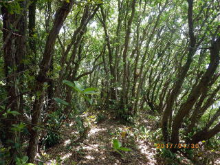 | (15) 約86分後、いくつもの小ピークとあん部を通り、いよいよ最後の登りです。距離約1..6Km。標高約91m。 | (16) あん部の右側は崩壊していて、危険です。 | |