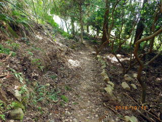 | (11) 船隠を抜けると山路となります。左側が海です。 | (12) 10時54分頃、みかん畑の中もコースの一部です。 | |