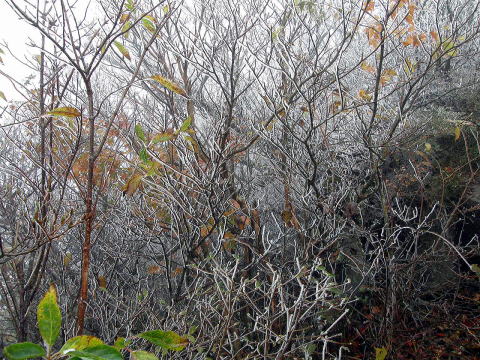 | (20) 右折ししばらくすると歓声がが上がりました。霧氷です。霧で紅葉は今一でしたが、思わぬ贈り物です。 |