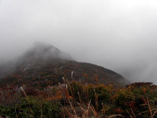 | (29) 紅葉と霧氷を堪能した後、天狗分れまで戻り、高塚山の案内標識に従い登って行きます。途中一瞬ですが、ガスが切れ天狗の紅葉が姿を見せました。残念ながらカメラが間に合いませんでした。 |