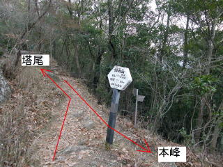 (23) 約57分で、塔尾と本峰(三角点)の分岐です。塔尾までは80m。すぐです。 |