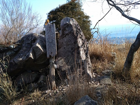 | (9) 9時40分頃、山頂着です。判読やや不明な山名看板が出迎えてくれます。標高812m。距離約3.0km。 |